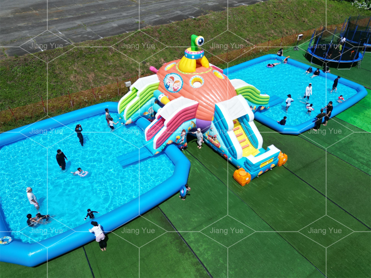 • The large inflatable water castle is a favorite for kids. The castle has climbing nets, slides, fountains and other play elements, so that children can enjoy playing and exploring.