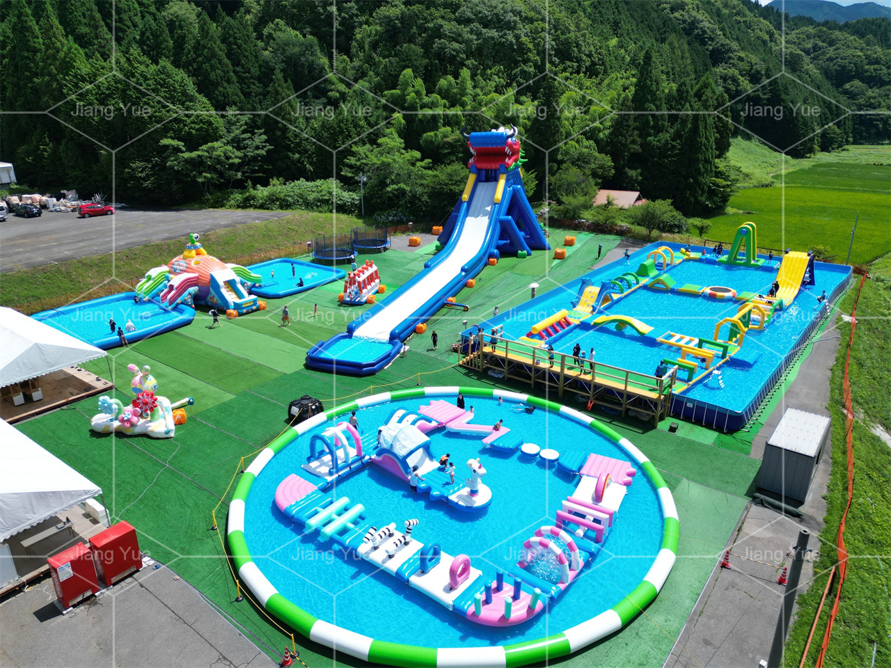 • Ski resorts often boast undulating terrain, which provides a wealth of variation in the layout of inflatable water parks. Various water slides can be set up with different height differences to increase the excitement and interest of play. For example, a spiral water slide is set up from the higher slopes, allowing visitors to experience the thrill of high-speed downhill.