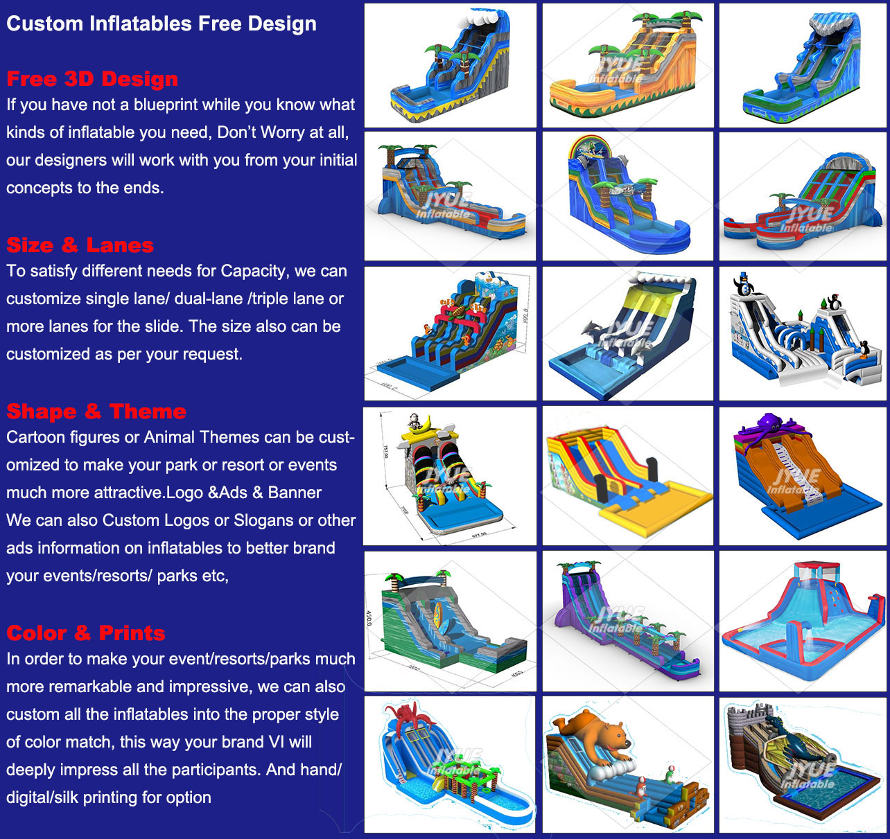 Our inflatable water slide is various, attractive and colorful which is widely beloved by kids and adults. We can make the inflatable water slide according to your own size, design, color, printing, etc. to meet your requirements. We have full confidence can provide you with the excellent inflatable water slide at a reasonable price, when you receive our inflatable water slide, you're sure will satisfied with our products, so if you're looking for the inflatable water slide, Jyue is your best choice!