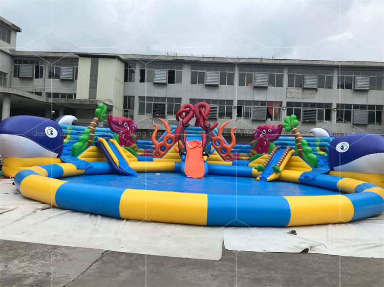 It is a water park, which is made of PVC material. The color can be customed according to the requirements of customer.It is suitable for family,school and so on.The purpose of the product is to exercise body and to add interest.