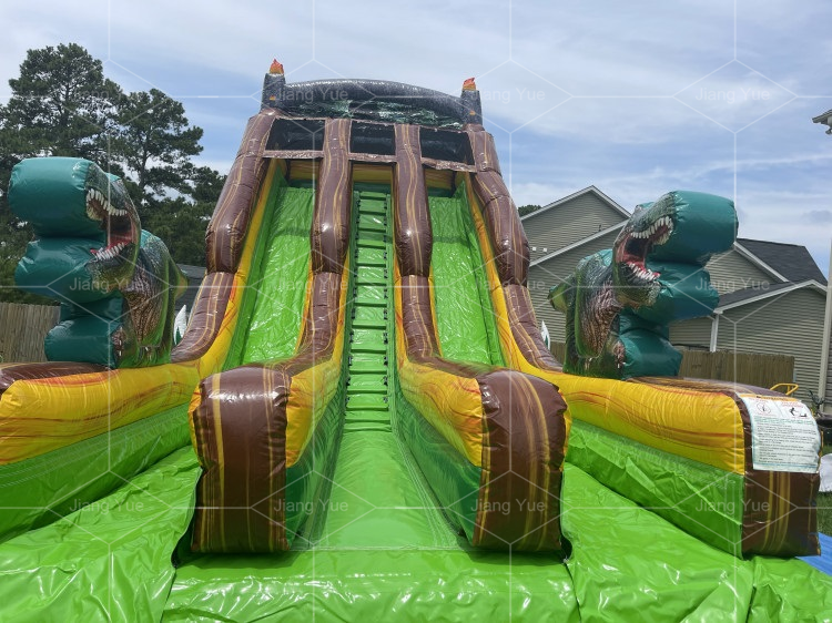 Climb to the top of this prehistoric hill where you will face a Tyrannosaurus who is out looking for her dinner! The rocky terrain leading to your entry is something to behold! Go deeper into the badlands and look for the perfect place of refuge. There you will find your spot and become the greatest explorer of all time!! This vibrant Dinosaur Slide brings to life all of the adventure and intrigue of a prehistoric journey. You will be able to climb, slide, and tumble around this forgotten land, and won’t have to worry about the wrath of these creatures! Your slide to the bottom brings you to a young, hatching TRex. Is this what mama-Rex was looking for all along? This slide can be used wet or dry. The dimensions for this product are 20′ x 38′ x 16′.