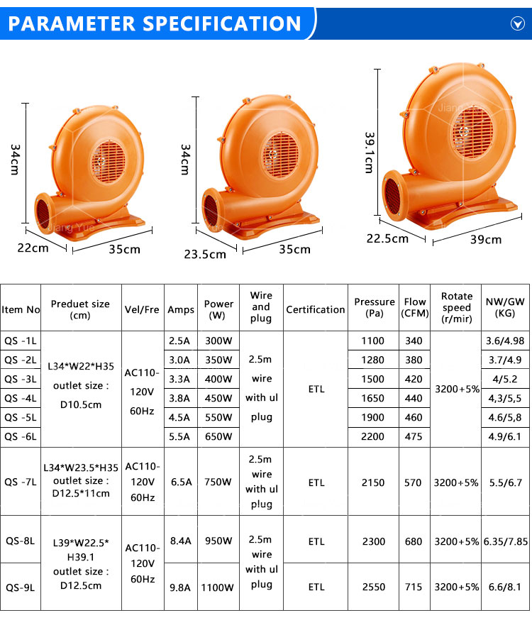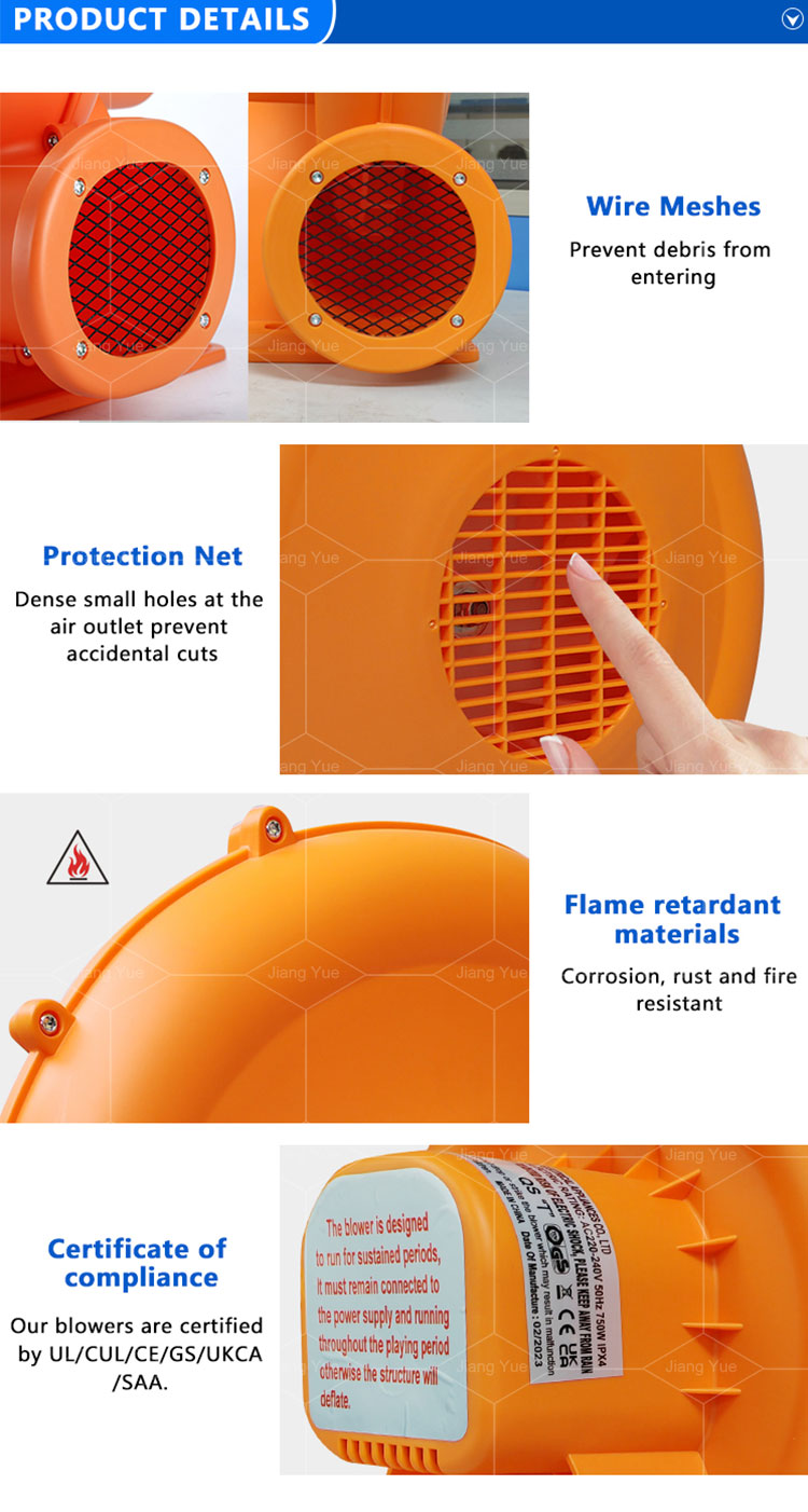 It has a strong motor which can makes high-colume air flow,it is mainly used for the large inflatable item,such as inflatable arch ,inflatable pumping bed which children can jump,inflatable castle and so on.